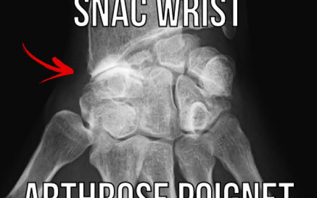 – SNAC Wrist : Le «  Scaphoid Nonunion Advanced Collapse » correspond à une usure progressive de toutes les surfaces articulaires du poignet, ayant pour origine une pseudarthrose du scaphoïde, c’est à dire une absence de consolidation après fracture. Cet os consolide très difficilement après une fracture qui peut très bien passer inaperçue tant elle est difficile à voir sur une simple radiographie par des médecins qui ne sont pas spécialisés. Le patient consulte alors quelques années après un traumatisme (le plus souvent chute sur le poignet), pour des douleurs croissantes du poignet, baisse de force et limitation des amplitudes articulaires du poignet. Le diagnostic est évident pour nous sur une simple radiographie du poignet. Nous demanderons systématiquement un arthroscaner pour évaluer les surfaces articulaires des différents os du poignet encore viables et orienter notre option thérapeutique qui sera toujours chirurgicale : oubliez les infiltrations qui ne font que masquer la douleur et laissent l’anatomie se dégrader….
